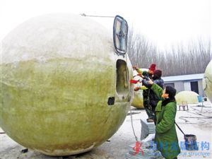 農民造“諾亞方舟”儲兩噸糧一噸水 12月7日,在河北省香河縣鉗屯鄉的一個工廠內,農民劉啟元展示其自主研制的“諾亞方舟”。該救生艙整體為球狀,分里外兩層,里層為球形鋼結構,中間是防水防火棉,外面涂刷了30層的纖維樹脂,再刷上防腐漆,做到了防水、防火、防輻射、防冰寒;內部還配有發動機、儲能電瓶,可保存兩噸糧食、一噸飲用水。艙內設置標準救生座椅9個,配有安全帶,如遇緊急情況最多可裝30人。劉啟元說,正加緊進行技術升級改造,期望定型量產用于實際救援。 |