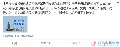 政治局會(huì)議審議通過(guò)《京津冀協(xié)同發(fā)展規(guī)劃綱要》